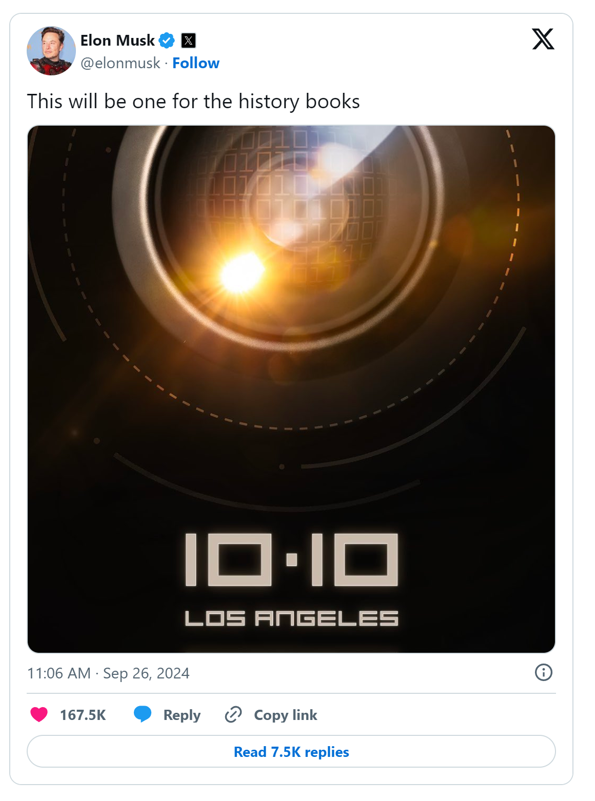 안녕하세요. 파이어메이입니다! 테슬라가 오는 10월 10일 로스앤젤레스에서 열릴 로보택시 공개 행사를 앞두고 있습니다. 이번 행사는 '우리, 로봇(WE, ROBOT)이라는 태그라인과 함께 진행되며, 일부 주주와 언론사들에게 초대장이 발송되었습니다. 테슬라의 CEO 일론 머스크는 자신의 X 계정(구 트위터)에 초대장 이미지를 공유하며, 이 행사가 '역사에 남을 일(This will be one for the history books)'이라고 강조해 많은 사람들의 기대를 불러일으키고 있습니다.
