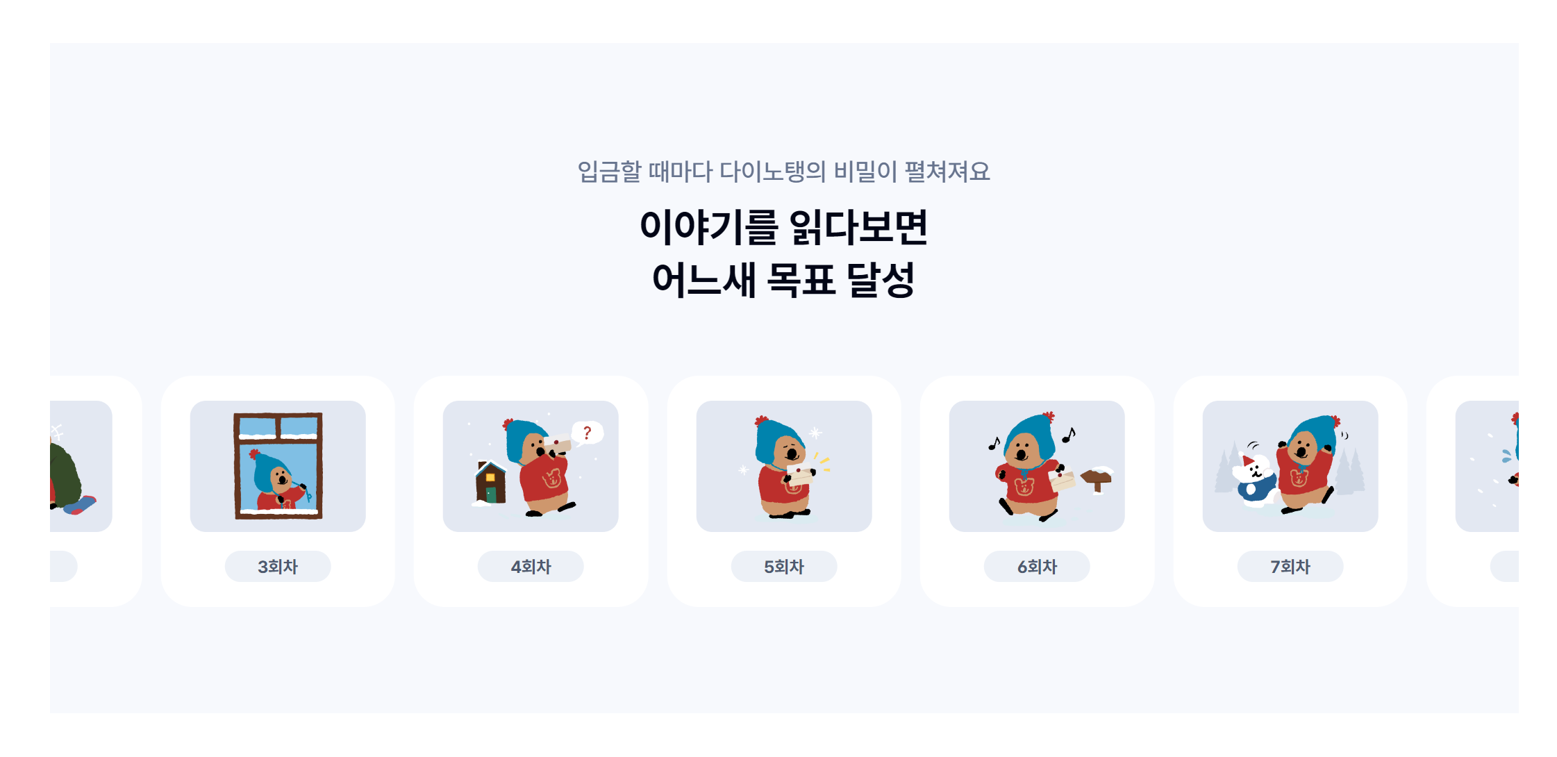 2. 다이노탱 스토리 : 매일 적금을 입금할 때마다 귀여운 다이노탱이 등장하는 새로운 스토리도 확인할 수 있습니다. 에피소드 총 31편의 이야기가 한 달 동안 펼쳐집니다.