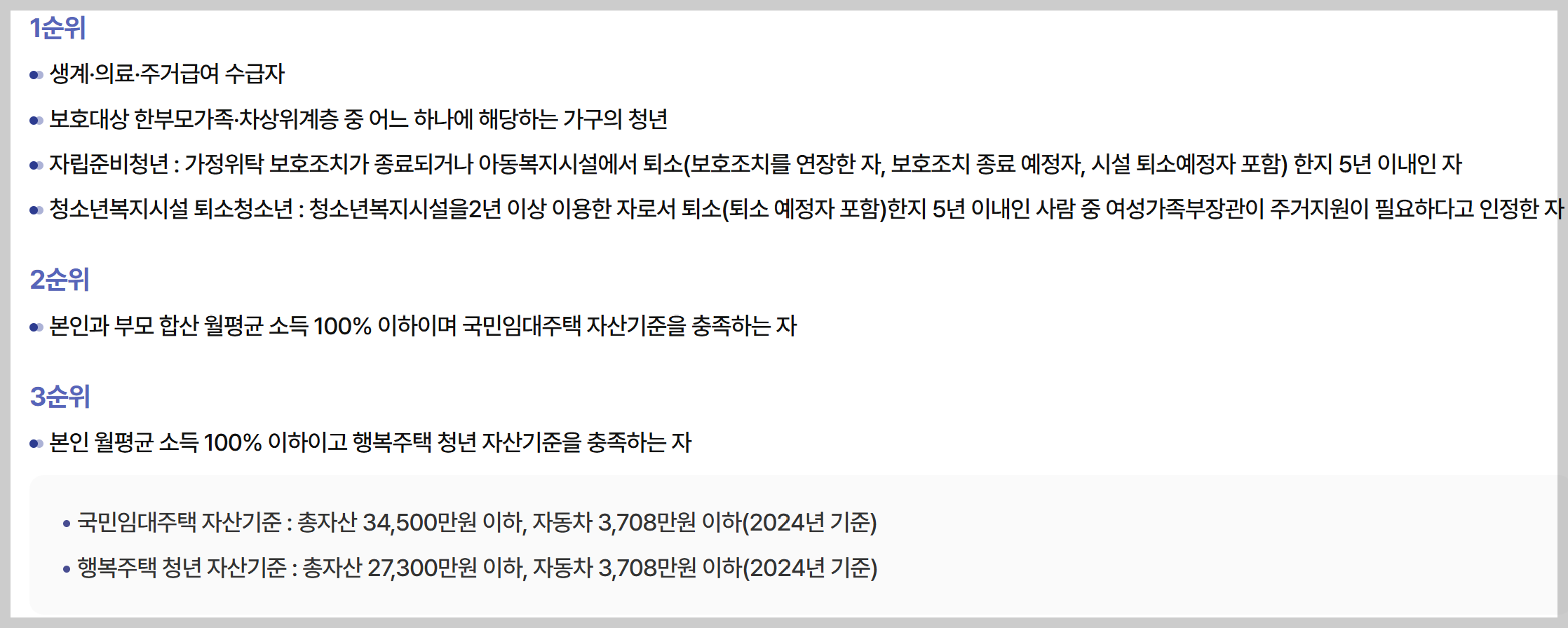 - 3순위 : 본인의 소득 및 자산이 기준을 충족하는 청년