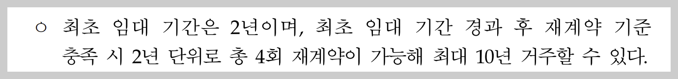 - 요건 충족시 재계약 4회 가능, 최대 10년 거주 가능