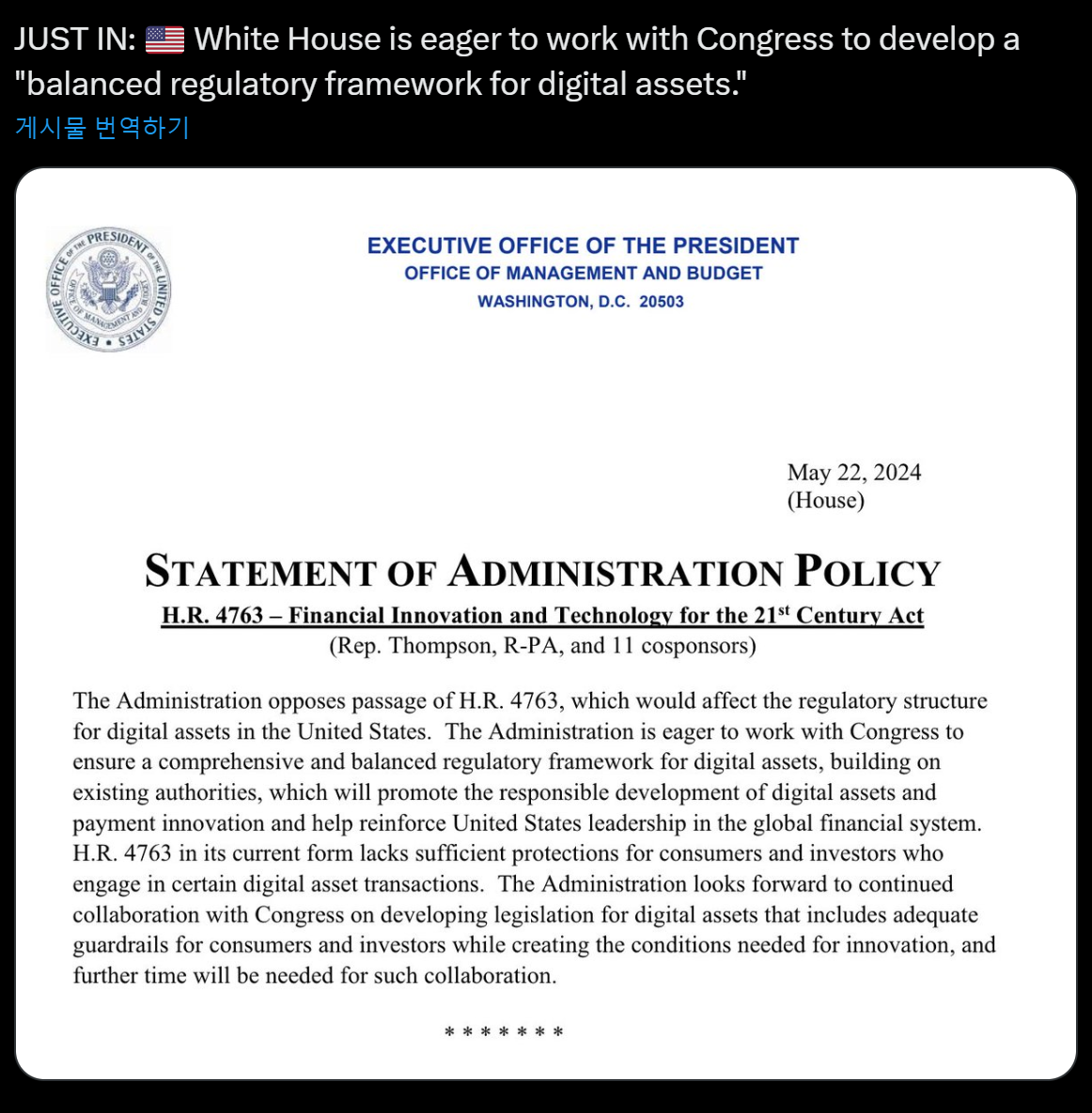미국 대통령 행정실은 H.R. 4763, 2021년 금융 혁신 및 기술 법안(FIT 21)에 대한 행정부 정책 성명을 발표했습니다. 이 법안은 디지털 자산에 대한 명확한 지침을 설정하는 것을 목표로 하며, 혁신을 촉진하면서도 소비자 보호와 금융 안정성을 보장하려고 합니다. 행정부는 FIT 21의 목표를 지지하지만, 디지털 자산과 관련된 위험을 다루고 금융 시스템을 보호하기 위해 강력한 규제 프레임워크의 필요성을 강조했습니다 (The White House).
