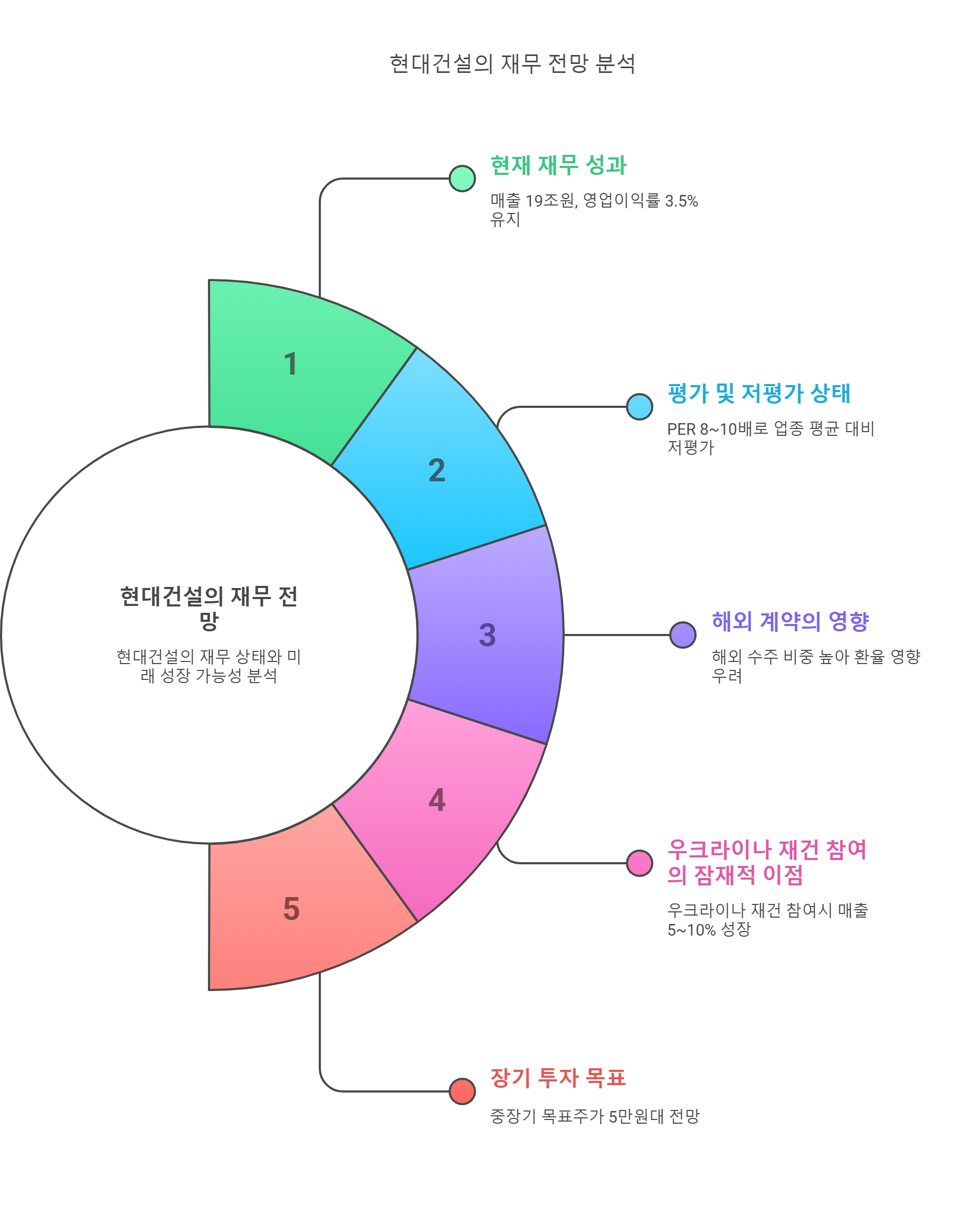현대건설은 환경 인프라와 에너지 플랜트 분야에서 확보한 기술 경쟁력을 바탕으로, 현재 저평가된 주가 수준을 극복하고 상승 여력을 충분히 발휘할 잠재력을 가지고 있습니다. 특히, 해외 수주 확대 전략과 우크라이나 재건 사업 참여를 통해 시너지를 창출하며, 지속적인 성장 동력을 확보할 수 있을 것으로 기대됩니다.