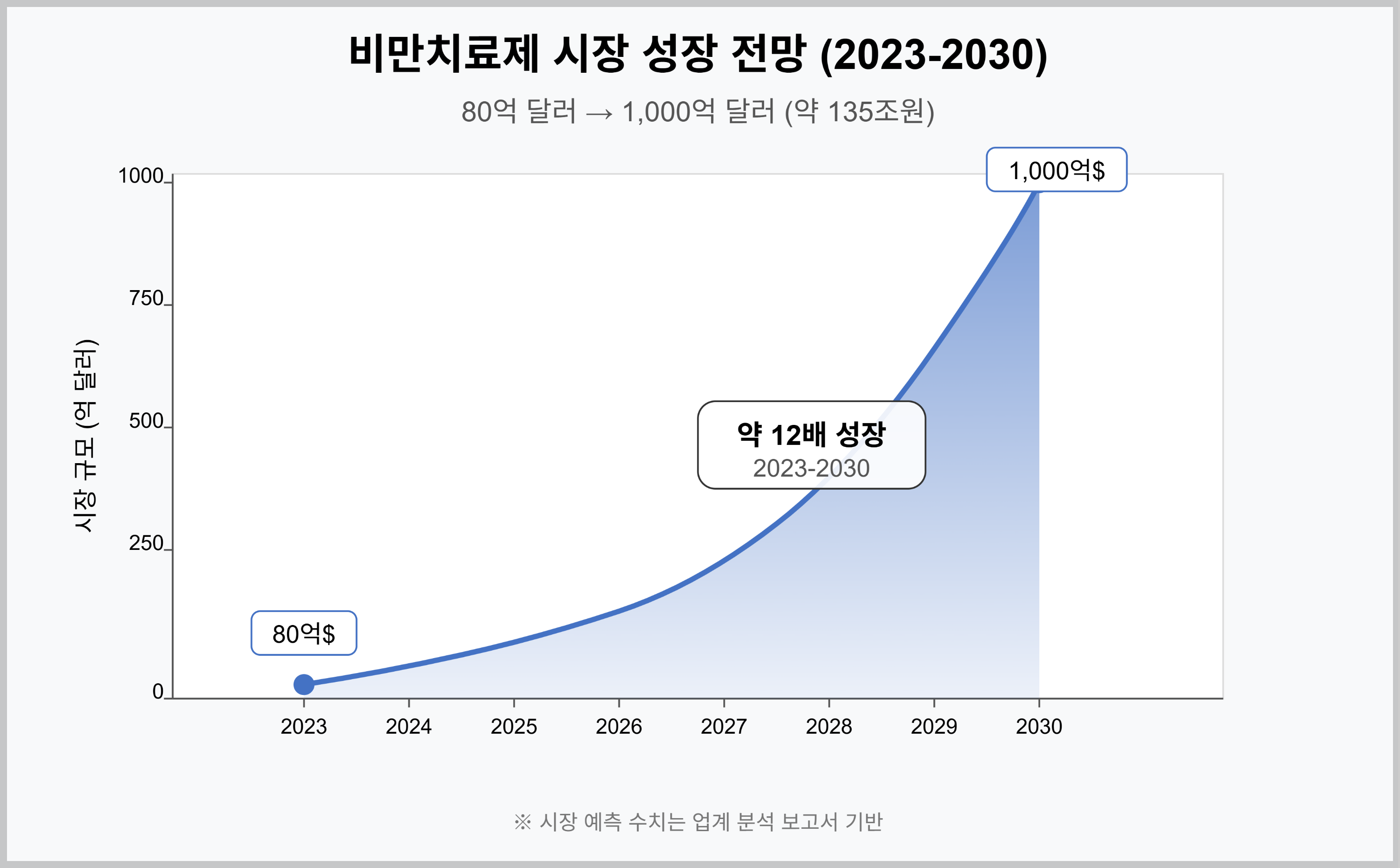 2023년 약 80억 달러였던 시장이 2030년까지 무려 1,000억 달러(약 135조 원) 규모로 성장할 것으로 예상되고 있어요. 이런 황금 시장을 두고 일라이릴리와 노보노디스크가 치열한 경쟁을 벌이고 있죠.