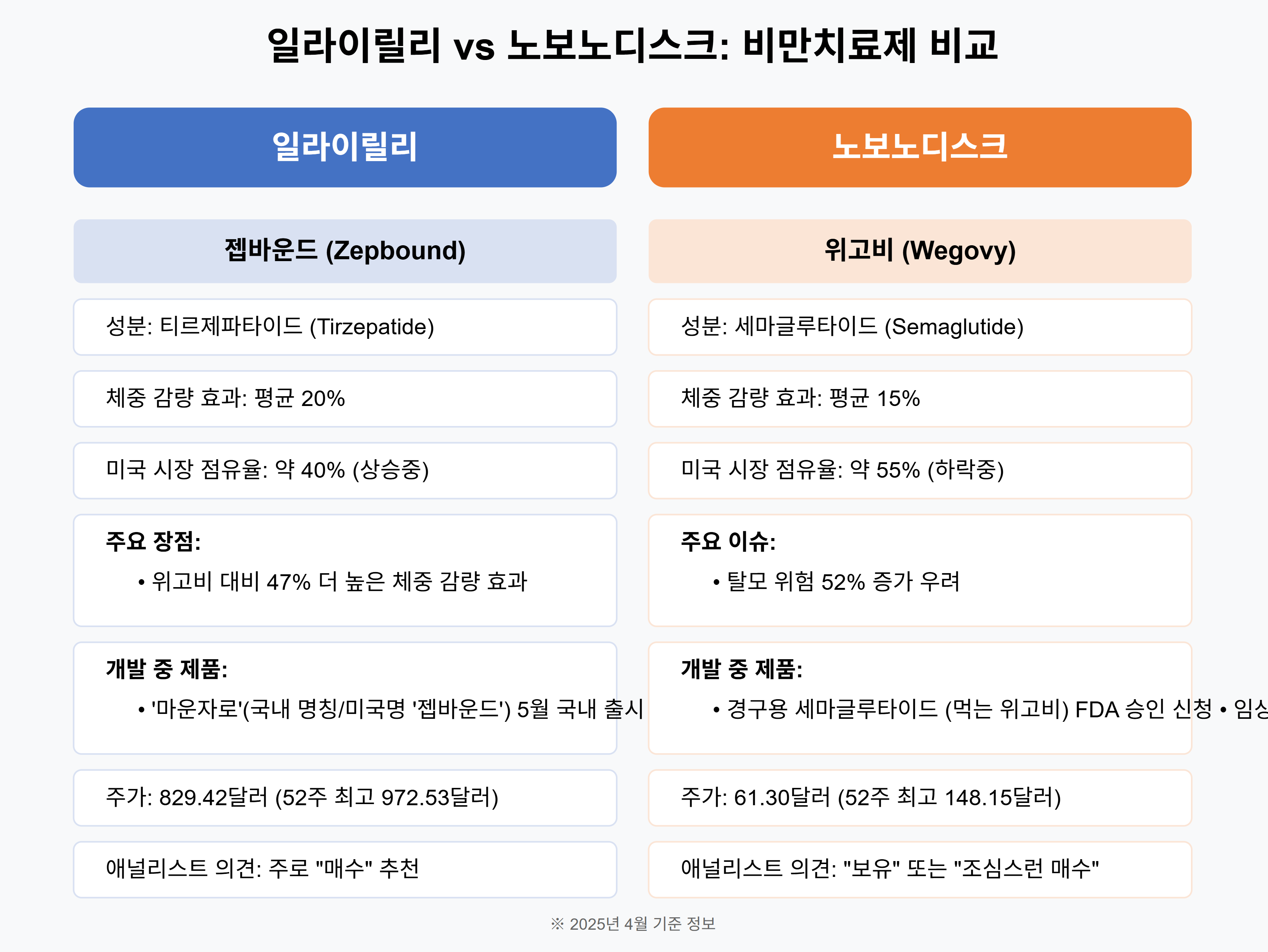 두 회사 모두 장기적으로는 유망하지만, 현재 상황만 놓고 보면 일라이릴리가 더 강한 모멘텀을 보이고 있어요. 젭바운드의 우수한 임상 결과와 빠른 시장 점유율 확대, 그리고 글로벌 진출 전략이 주가에 긍정적인 영향을 미치고 있죠.