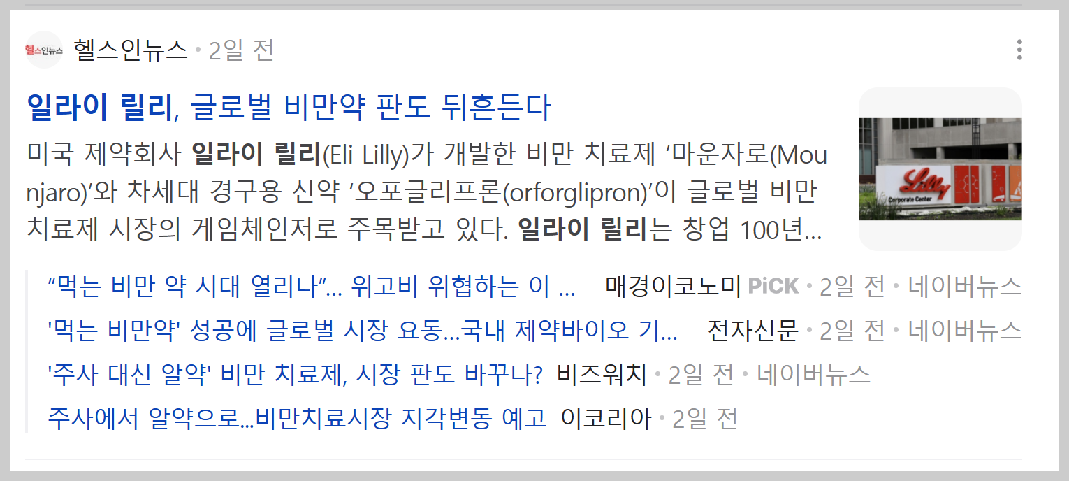 일라이릴리는 최근에 인도 시장에도 진출하면서 글로벌 확장에도 적극적인 모습을 보이고 있고, 경구용 비만 치료제 '오포글리프론'도 개발 중이라 앞으로가 더 기대되는 기업이에요. 오포글리프론은 올해 FDA 허가 신청을 추진 중이라고 해요.