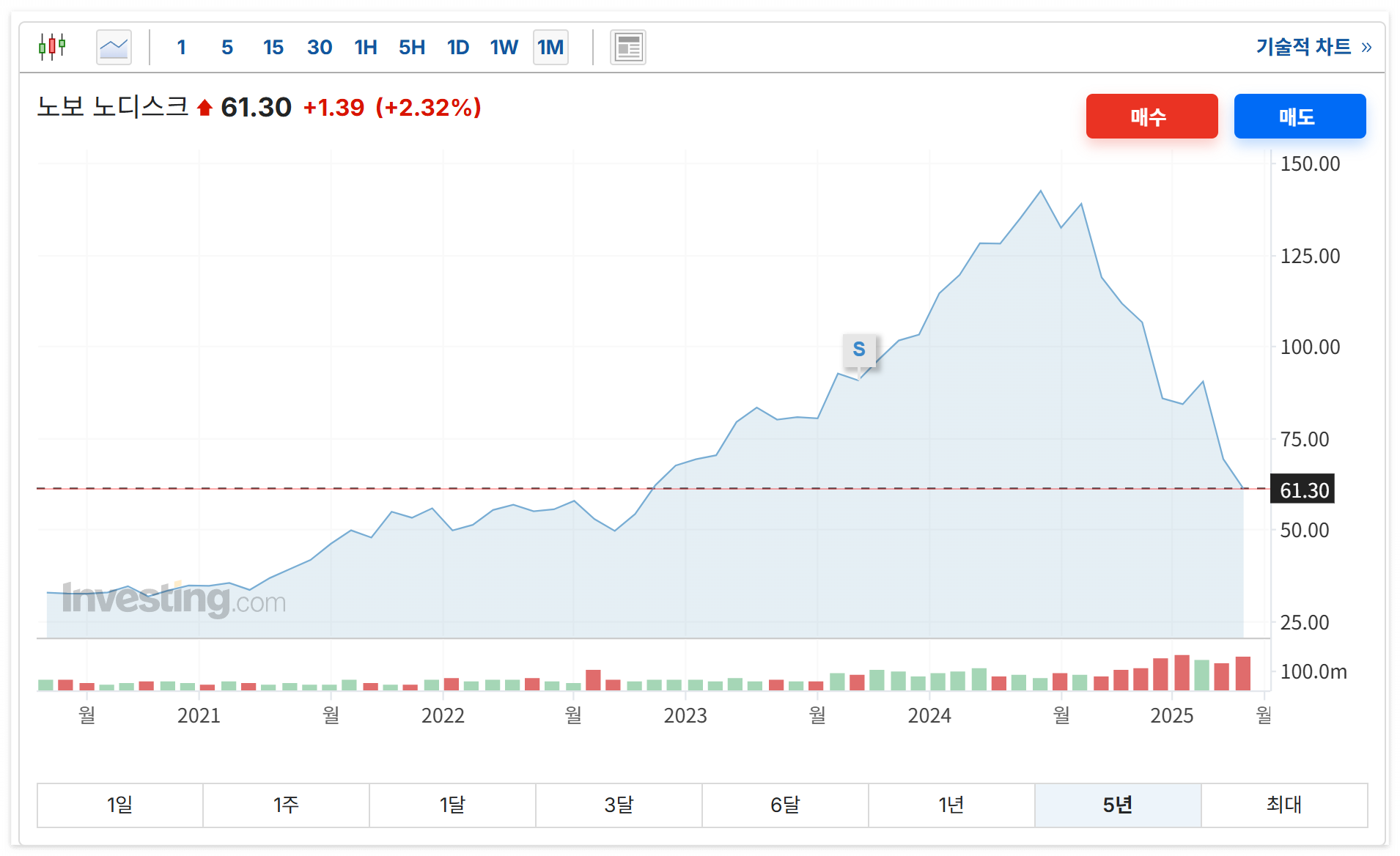 주가도 조금 아쉬운 상황이에요. 1년 전 140달러에서 현재는 약 61달러로 하락했는데, 일라이 릴리의 상승세와 비교하면 확연한 차이가 있죠.
