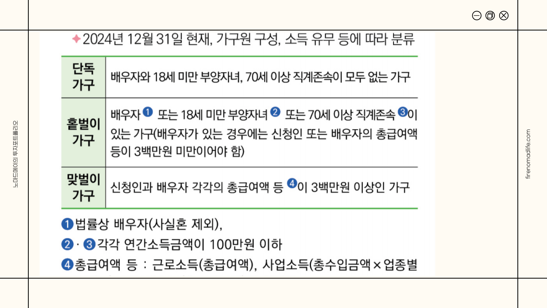 - 재산 한도 : 2024년 6월 1일 기준 가구원 전체의 재산 합계액이 2억 4천만원 미만