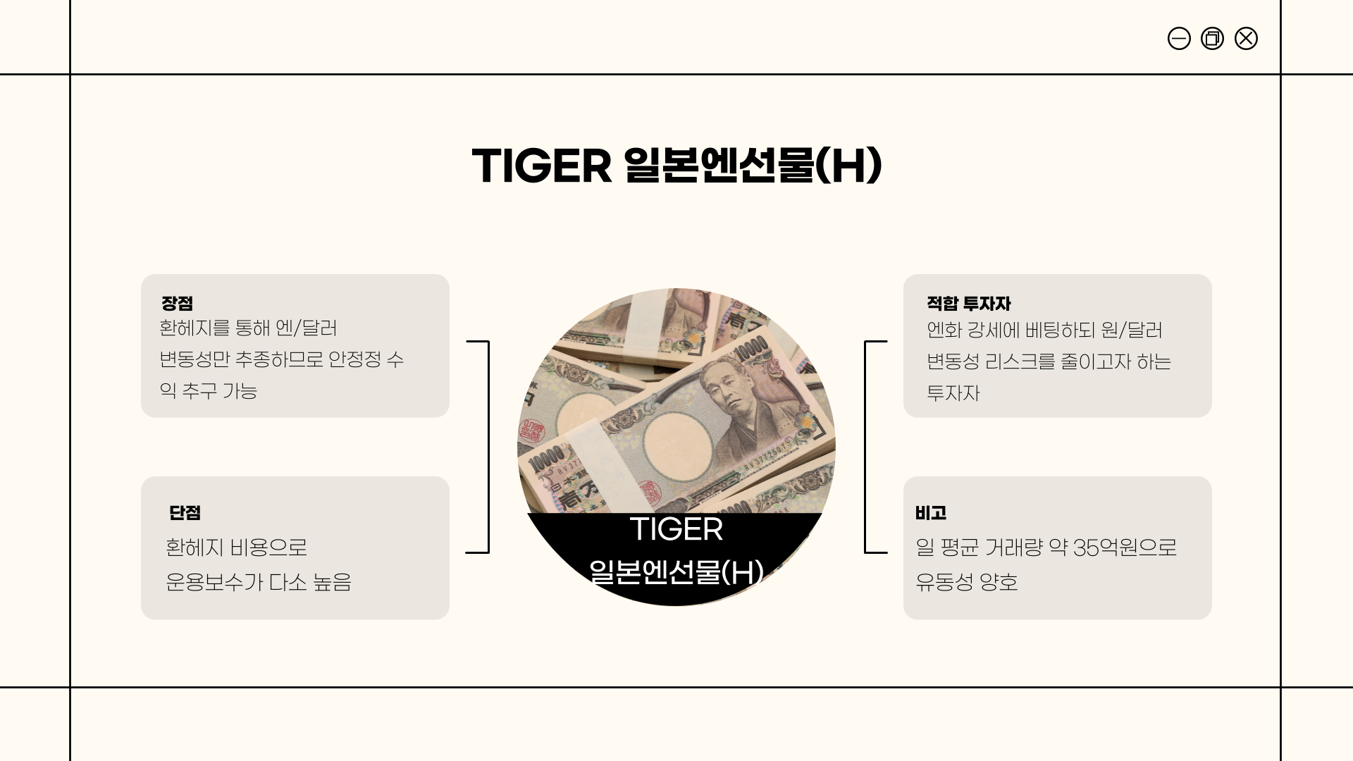 - 적합 투자자 : 엔화 강세에 베팅하되 원/달러 변동성 리스크를 줄이고자 하는 투자자